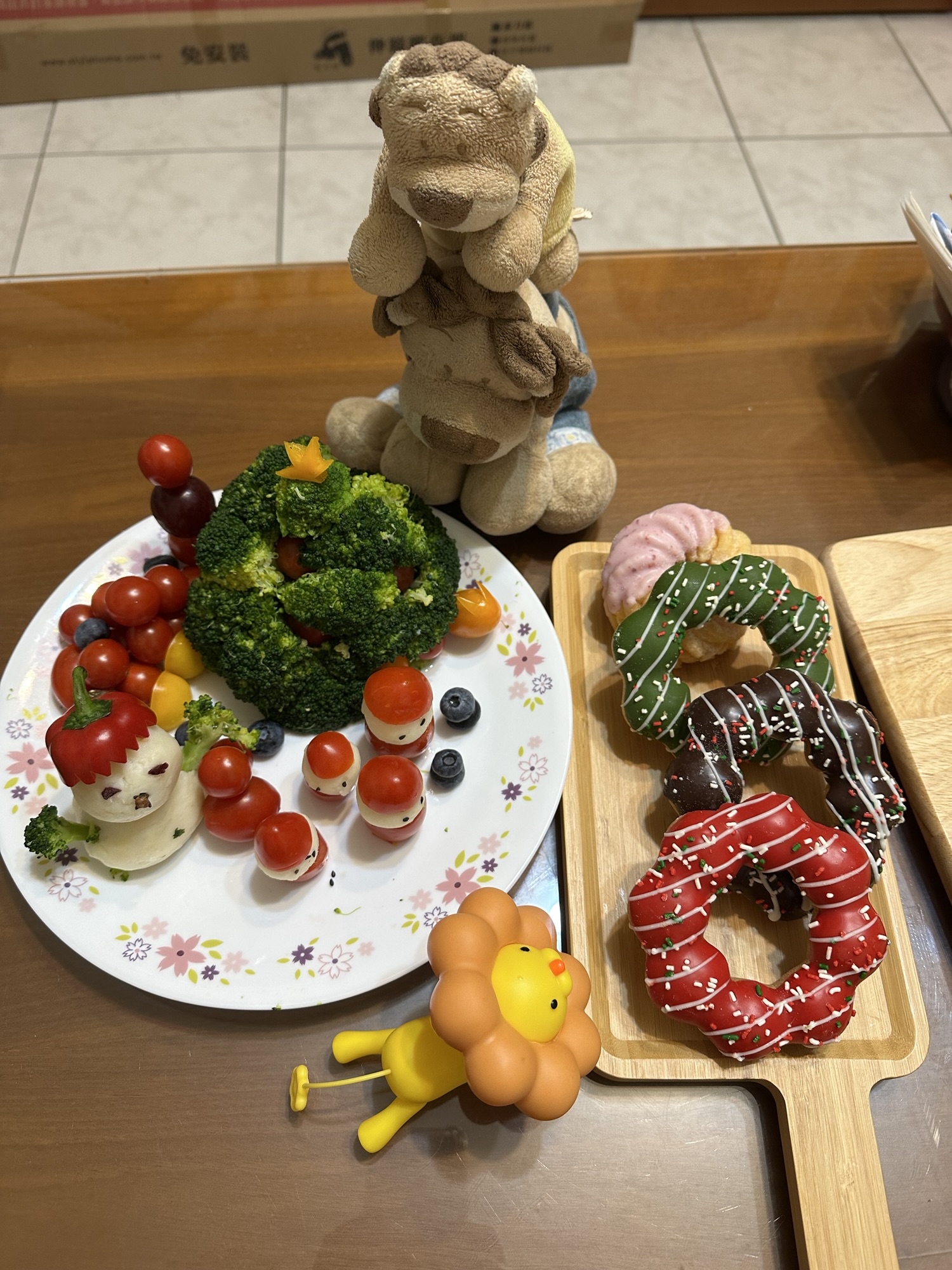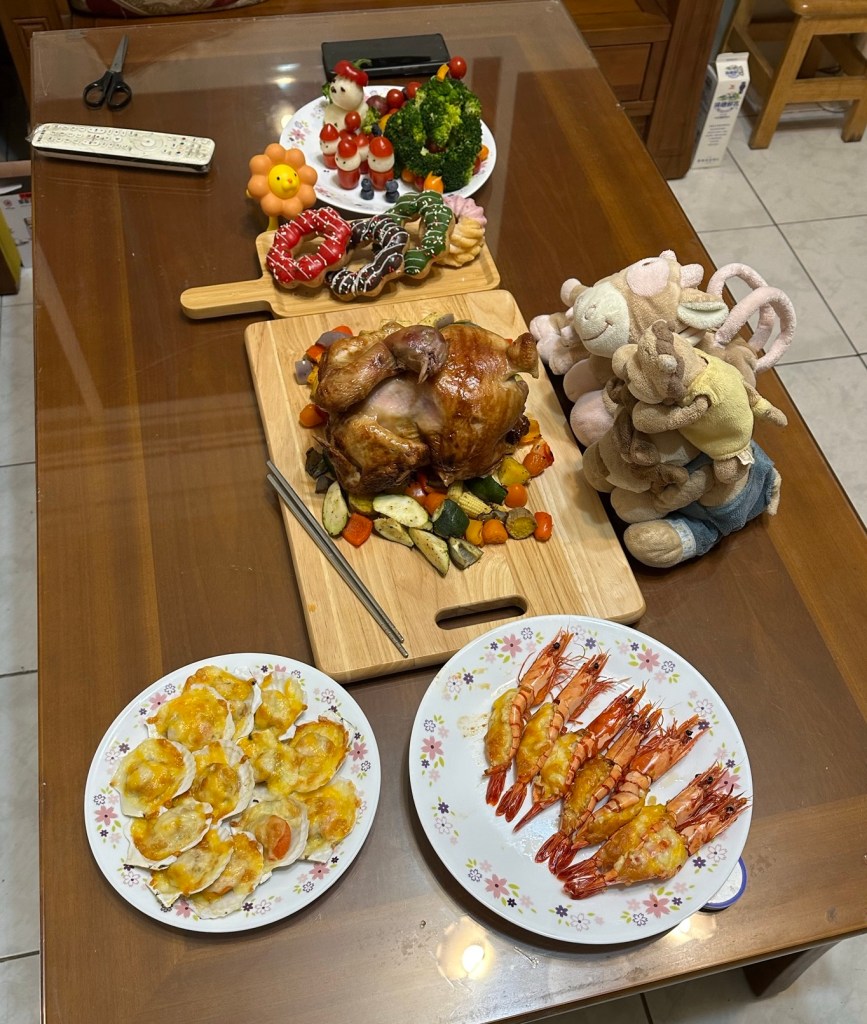 聖誕節應景,方便起見便去Costco買了烤雞,將節瓜蕃茄彩椒杏包菇地瓜洋蔥切一切,加點玫瑰鹽巴,黑胡椒鹽巴薩米酒醋,放進氣炸鍋烤,一道漂亮的聖誕烤雞大餐就完成,海莉將蝦子處理好,上面放大蒜及起士,及將扇貝鋪上起士,送進烤箱一道美味的焗烤鮮蝦及扇貝料理就完成。